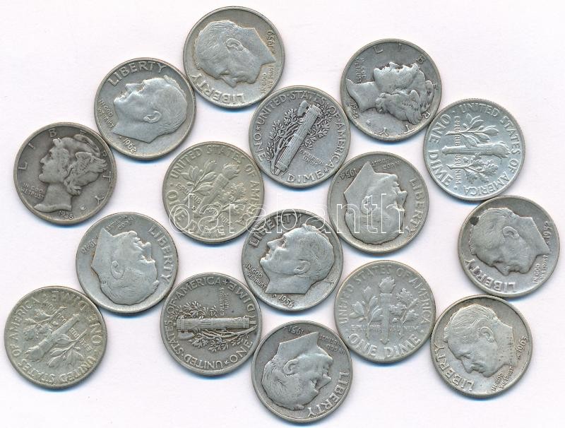 USA 1935-1... https://www.darabanth.com/hu/363-Gyorsarveres/363.0/Numizmatika/Kulfoldi-fem-es-ezustpenzek~2000014/Amerikai-Egyesult-Allamok-1935-1964-1d-Ag-16xklf-T1-3-USA-1935-1964-Dime-Ag-16xdiff-CAU-~II2099949