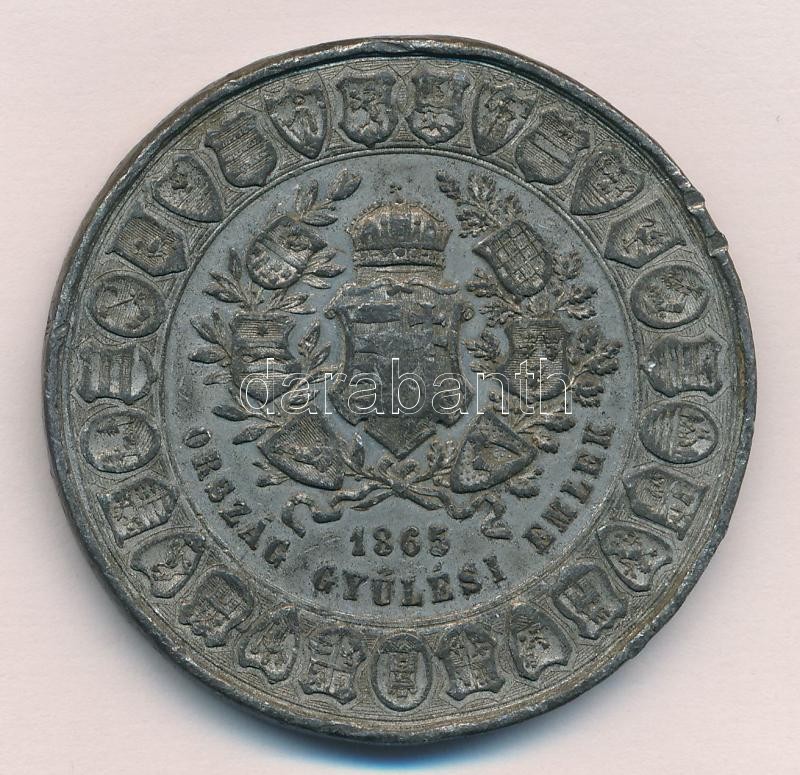 1865. "Országgyűlési Emlék" Sn emlékérem, "FM" gyártói jelzéssel "1865 ORSZÁG GYŰLÉSI EMLÉK / MIDŐN SÖTÉT LESZ A VILÁG - ÉS MINDEN TŰZ KIÉG - A HONFISZÍVBEN FENMARAD EGY ÉLŐ SZIKRA MÉG. - E SZIKRA FÉNYT AD ÉS HEVET - S ÉG OLTHATATLANUL - OH HONFI, ŐRIZD E TÜZET - S NE FÉLJ, HA VÉSZ BORUL." (50mm) T:2- ph.