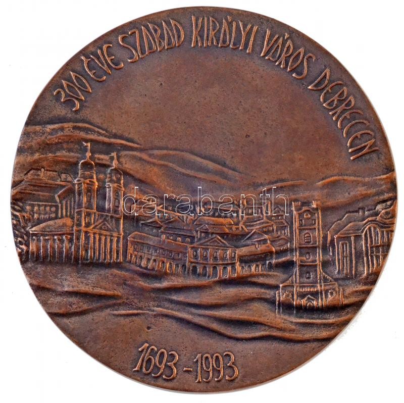 1993. "300 éve Szabad Királyi Város Debrecen 1693-1993 / NOS LEO POLDV DIVIND FAVENTE CLEMENTIA - ELECTUS ROMANORUM" kétoldalas, öntött Br plakett, eredeti tokban (100mm) T:1-