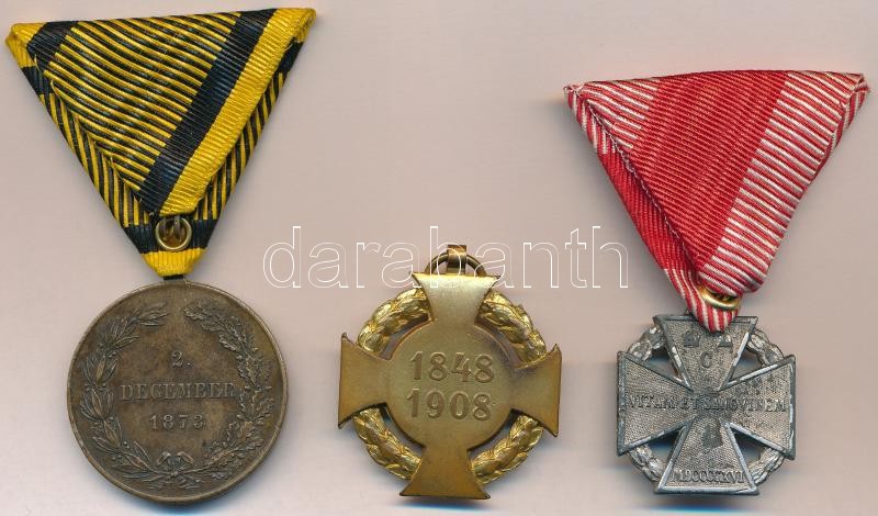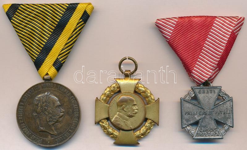 Leírás: 1873. "Hadiérem" Br katonai érdemérem modern mellszalaggal + 1908. "Katonai Jubileumi Kereszt" aranyozott Br kitüntetés mellszalag nélkül + 1916. "Károly-csapatkereszt" cink kitüntetés modern mellszalagon T:2,2- ph.