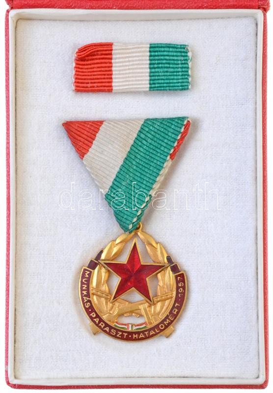 Leírás: 1957. "Munkás-Paraszt Hatalomért Emlékérem" aranyozott, zománcozott Br kitüntetés mellszalagon, szalagsávval, eredeti dísztokban T:1-