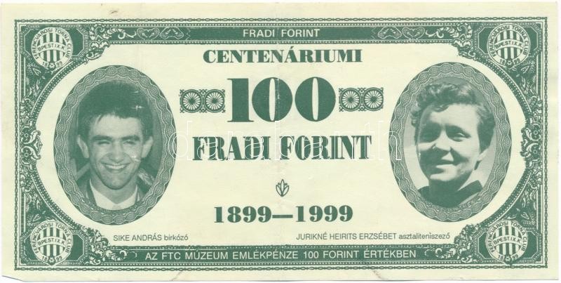 Leírás: 1999. 100Ft névértékű "Centenáriumi Fradi Forint" Sike, Jurikné, Mészáros, Dr. Lakat fényképével T:III