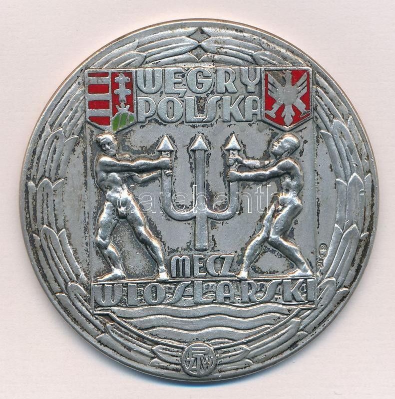 Poland 1938. "WEGRY POLSKA - MECZ WIOSLARSKI / POZNAN 1938" hallmarked Ag sports award medallion with enamel inlay of the Hungarian-Polish swimming championship (65,24g/0.800/54mm) C:XF