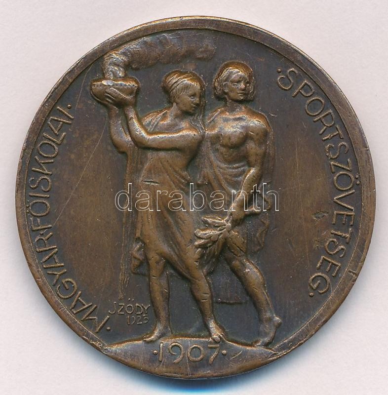 Leírás: Sződy Szilárd (1878-1939) 1928. "Magyar Főiskolai Sportegyletek Egyesülése - 1907 / Bajnoki Érem" Br díjérem, hátoldalon "DISCOS CS. II 928/9" gravírozással (40,5mm) T:2 ü.
