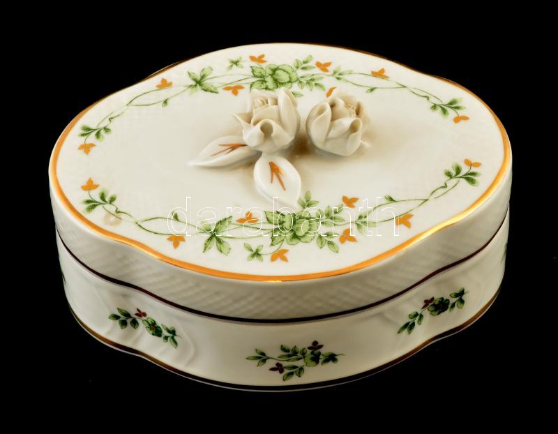 Leírás: Hollóházi Erika mintás bonbonier, matricás, jelzett, kis kopásnyomokkal, 15×10×7,5 cm
