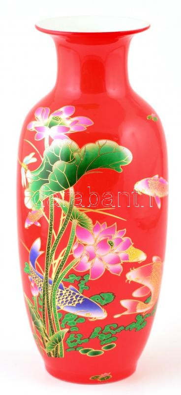Leírás: Kínai porcelán halas-virágos váza, matricás, jelzett, kis kopásnyomokkal, m: 37,5 cm