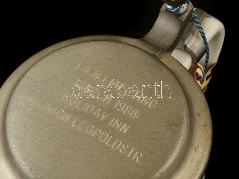 Leírás: Német porcelán sörös korsó, ón fedéllel, matricás, jelzett, kis kopásnyomokkal, m: 17 cm