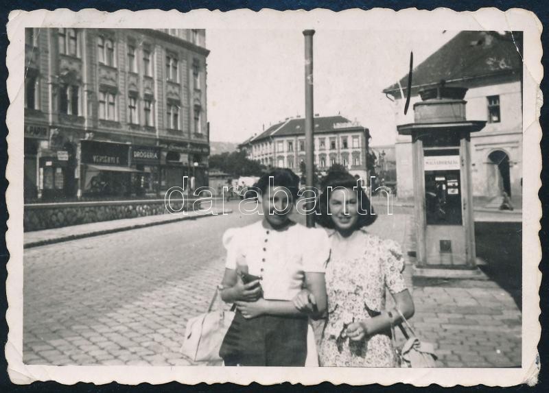 Leírás: 1940 Budapest, Széna tér hölgyekkel, feliratozott fotó, sarkán törésnyom, 6×8,5 cm