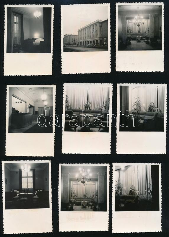 Leírás: 1955 Sztálinváros (Dunaújváros), Aranycsillag Szálló, belső részletek, 9 db fotó, hátoldalon feliratozva, 9×6 cm