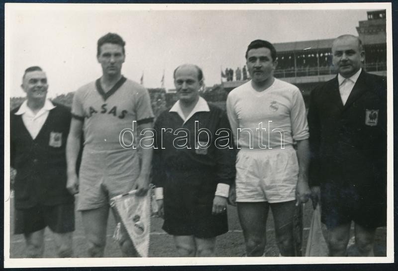 Leírás: 1958 Bp., Népstadion: Vasas-Real Madrid (2:0) futball mérkőzés, rajta a Vasas és Real Madrid kapitányai a zászlókkal, és a bírókkal, fotó, 6x9 cm