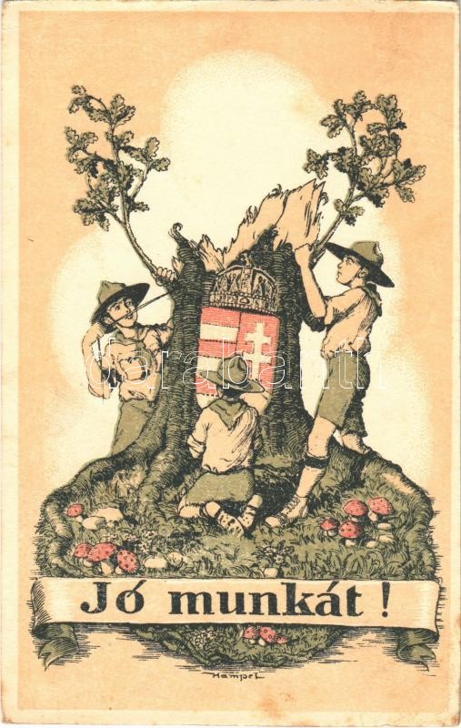 Leírás: Jó munkát! Kiadja a Magyar Cserkészszövetség hivatalos lapja a "Magyar Cserkész" / Hungarian irredenta scout art postcard s: Hampel