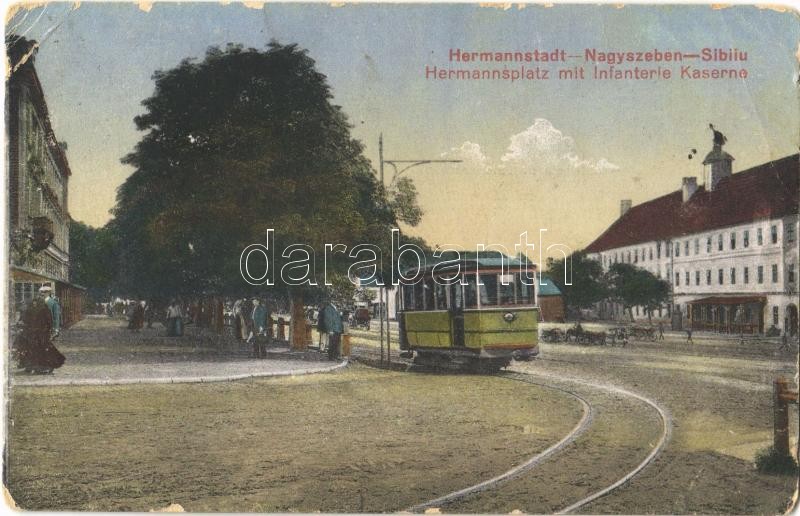 1917 Nagyszeben, Hermannstadt, Sibiu; Hermann tér, Gyalogsági laktanya... https://www.darabanth.com/hu/364-Gyorsarveres/364.0/Kepeslapok/Erdely~1000007/1917-Nagyszeben-Hermannstadt-Sibiu-Hermann-ter-Gyalogsagi-laktanya-villamos-square-militar~II2102056