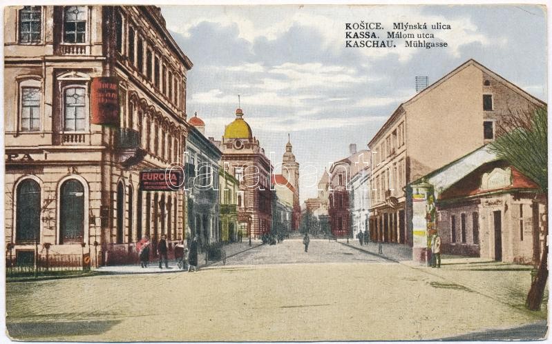 1922 Kassa, Kosice; Mlynská ulica / Malom utca, Europa szálloda / Mühl... https://www.darabanth.com/hu/364-Gyorsarveres/364.0/Kepeslapok/Felvidek~1000008/1922-Kassa-Kosice-Mlynska-ulica-Malom-utca-Europa-szalloda-Muhlgasse-street-view-hotel-~II1969041