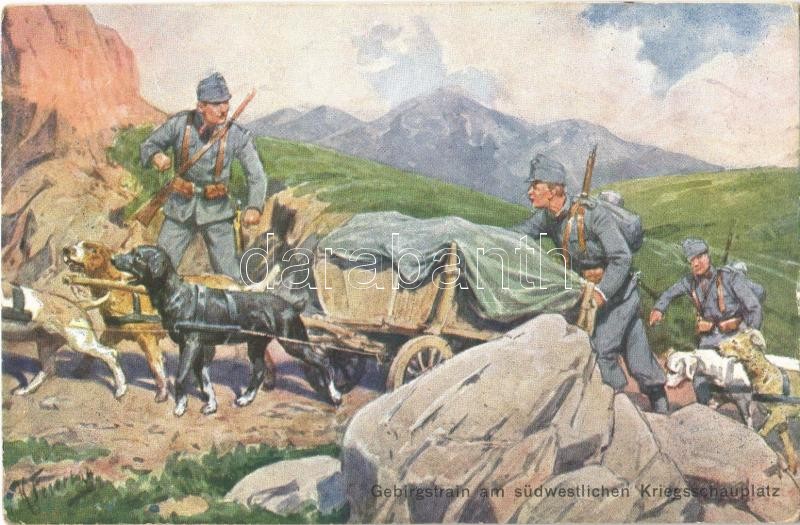 Leírás: 1915 Gebirgstrain am südwestlichen Kriegsschauplatz / WWI Austro-Hungarian K.u.K. military, mountain troop with dog-drawn packed carriages. B.K.W.I. 259-200. s: K. Feiertag (EK)