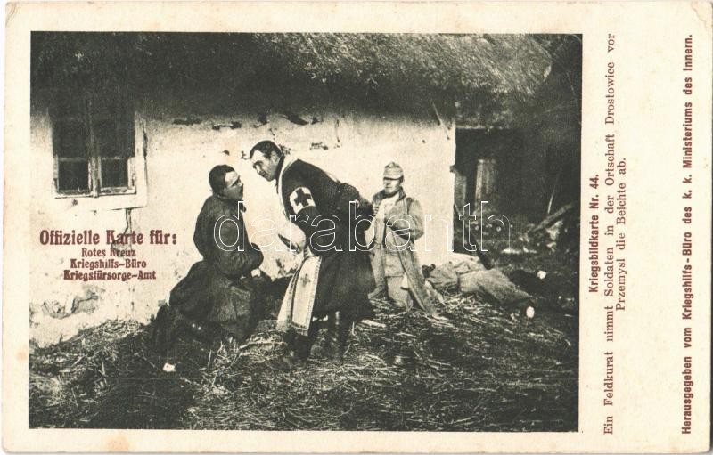 1915 Kriegsbildkarte Nr. 44. Ein Feldkurat nimmt Soldaten in der Orschaft Drostowice vor Przemysl die Beichte ab. Kriegshilfsbüro / WWI Austro-Hungarian K.u.K. and German military postcard, the field chaplain takes the confessions of soldiers by Przemysl (EK)