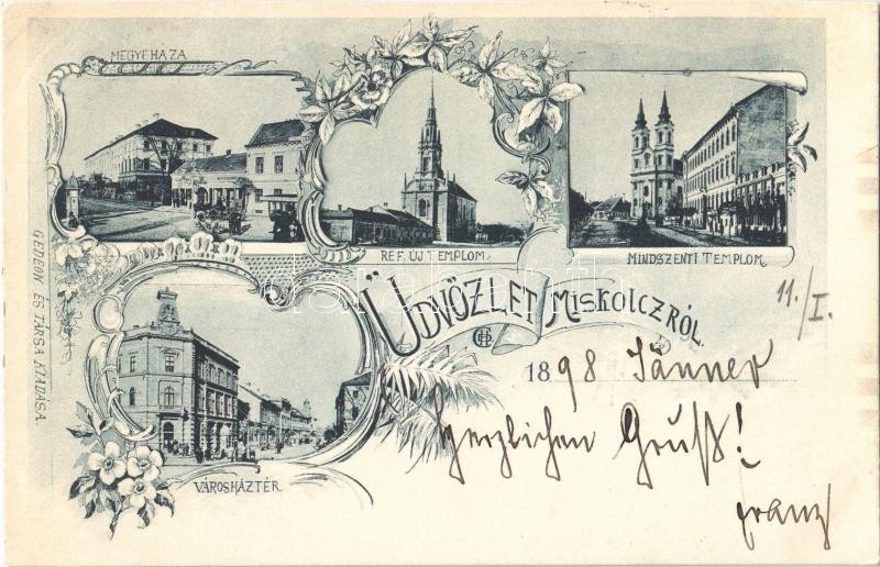 Leírás: 1898 Miskolc, Megyeháza, Református új templom, Mindszenti templom, Városháza tér. Gedeon és Társa kiadása. Art Nouveau, floral (vágott / cut)