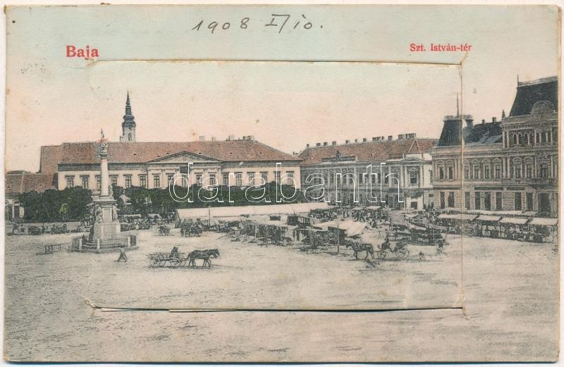 1908 Baja, Szent István tér, piac. Leporellolap https://www.darabanth.com/hu/364-Gyorsarveres/364.0/Kepeslapok/Magyarorszag~1000006/1908-Baja-Szent-Istvan-ter-piac-Leporellolap~II2104389