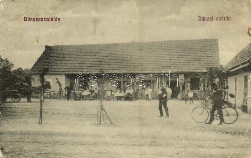 Leírás: 1910 Dánszentmiklós, Dános puszta; Fischli Mihály vendéglős Dánosi híres csárdája, étterem, az 1907-es hírhedt rablógyilkosság helyszíne, férfi kerékpárral. Cziriák fényképész felvétele (gyűrődés / crease)
