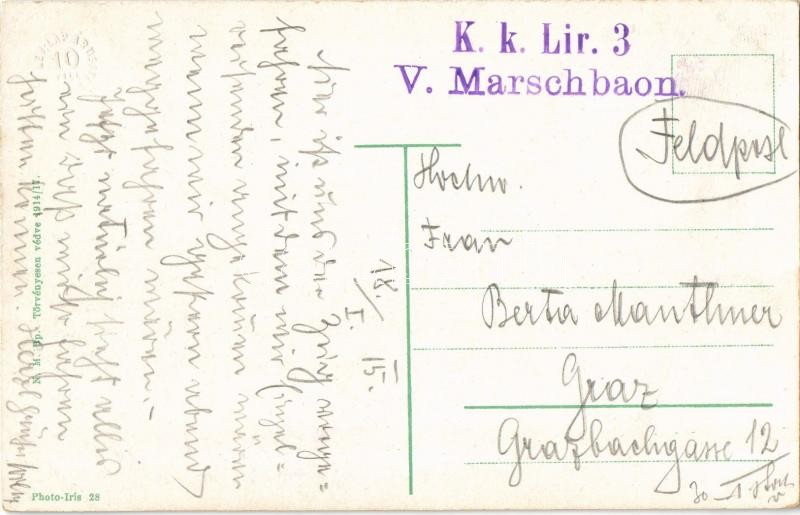 Leírás: 1915 Budapest VII. Keleti pályaudvar, Baross szobor + "K.k. Lir. 3. V. Marschbaon."