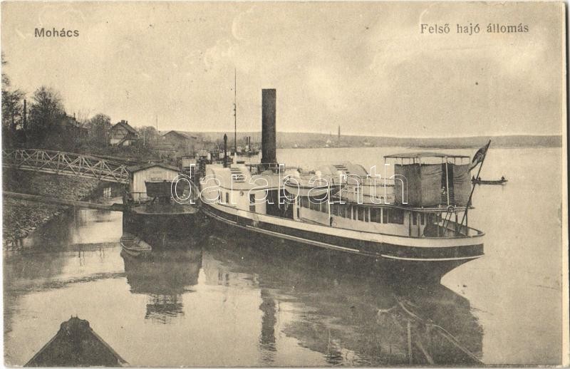 Leírás: 1916 Mohács, Felső hajóállomás, gőzhajó. Pollák Róbert kiadása