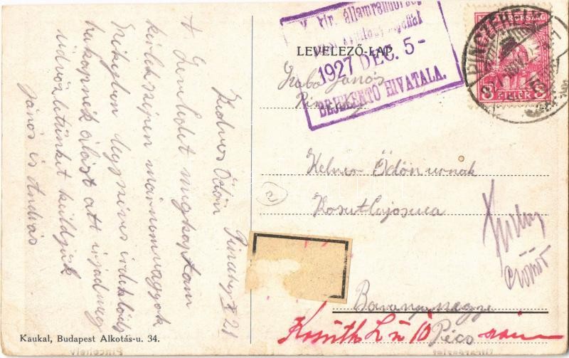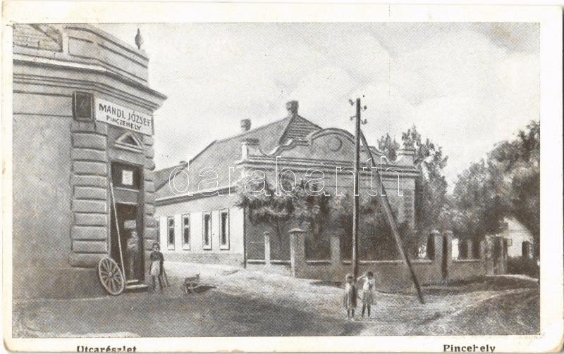 Leírás: 1927 Pincehely, utca, Mandl József üzlete + "M. kir. államrendőrség ... bejelentő hivatala" (EK)