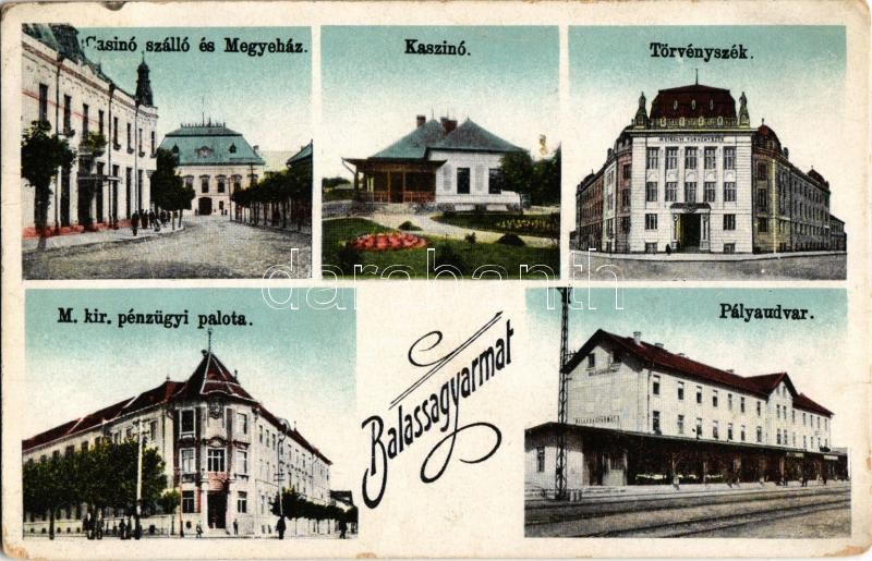 Leírás: 1931 Balassagyarmat, Casino szálloda és Megyeház, Kaszinó, Törvényszék, M. kir. pénzügyi palota, Pályaudvar, vasútállomás. Kiadja Réti (EK)