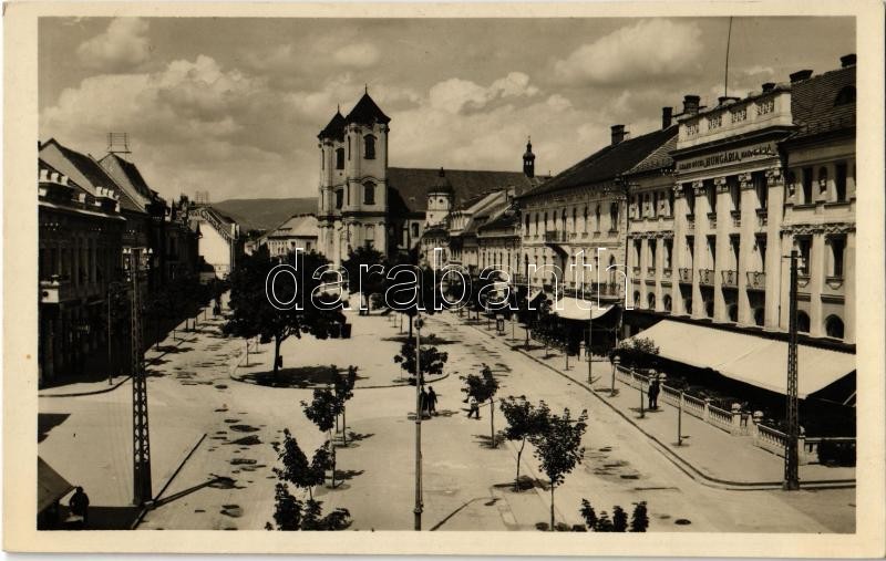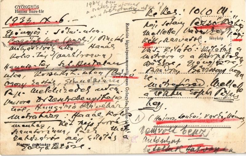 1933 Gyöngyös, Hanisz Imre tér, Grand Hotel Hungária nagyszálló, szálloda, Vida Cukrászda, fodrászat, Gyógyszertár, üzletek. Hátoldalon a gyöngyösi látnivalók leírása, "nem volt benzin, autónkat betoltuk Hatvanba"