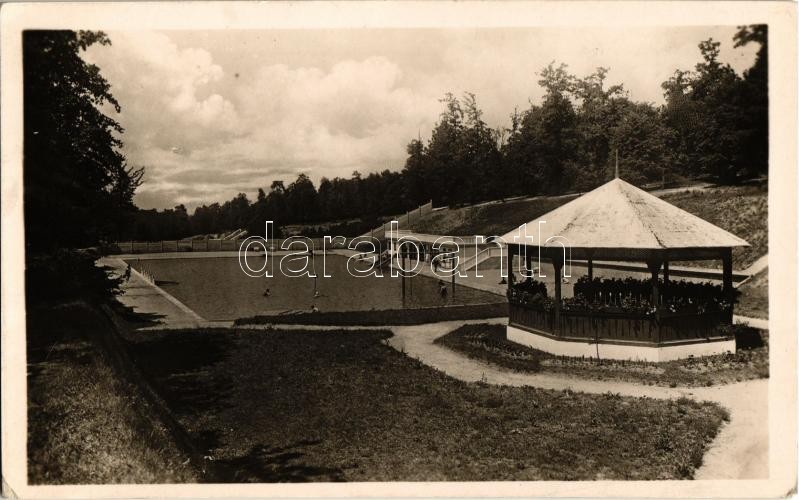 Leírás: 1937 Tatabánya, Magyar Általános Kőszénbánya Részvénytársulat tatai bányászata, Strandfürdő tisztviselők részére, medence, fürdőzők (EK)