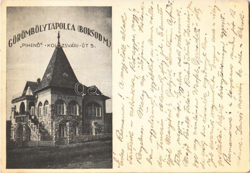 Leírás: 1943 Miskolctapolca, Görömbölytapolca, Görömbölyi-Tapolca, Tapolca (Miskolc); Pihenő szálló, villa. Kolozsvári út 5. (15,2 cm x 10,5 cm)