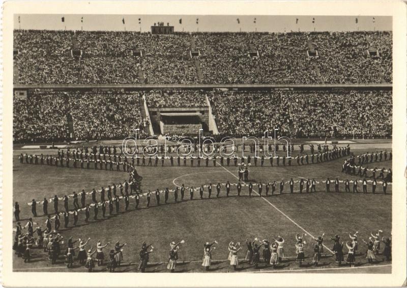 1953 Budapest, A népstadion ünnepélyes megnyitója. Magyar Foto, Gink Károly. Képzőművészeti Alap Kiadóvállalat / Opening ceremony of the People's Stadium - képeslapfüzetből / from postcard booklet
