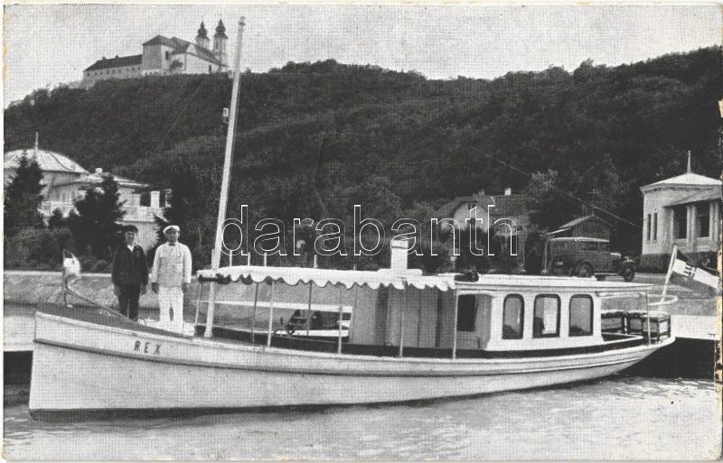 Balatonfüred, "REX I" motoros hajó a Balatonon, tulajdonos: Szakács József, háttérben automobil és a Tihanyi apátság. Szabó Imre fényképész felvétele (EK)