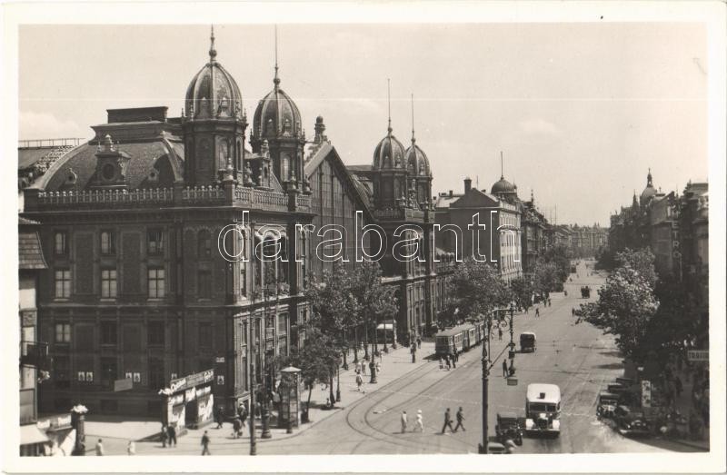 Leírás: Budapest VI. Nyugati pályaudvar, vasútállomás, villamos, autóbusz, automobil, trafik, üzletek