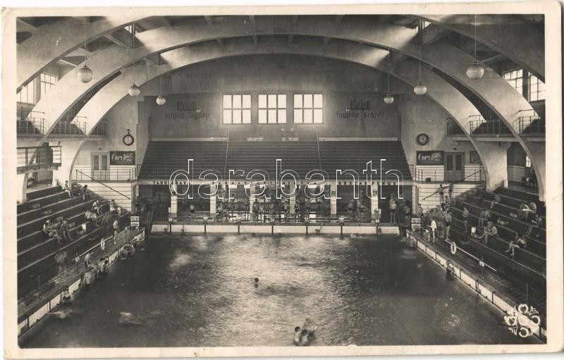 Leírás: Budapest XIII. Margitsziget, Nemzeti Sportuszoda, reklámok, úszók (fl)