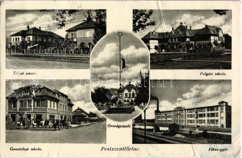 Leírás: Budapest XVIII. Pestszentlőrinc, Pusztaszentlőrinc, Szentlőrinc; Telepi iskola, Polgári iskola, Ganztelepi iskola, Filtex gyár, Országzászló (fa)