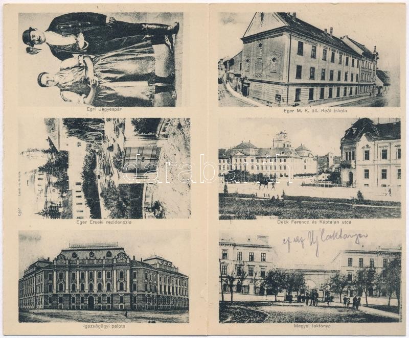 Eger, Jegyespár, érseki rezidencia, igazságügyi palota, m. k. áll. reál iskola, Deák Ferenc és Káptalan utca, Megyei laktanya (képeslapfüzetből / from postcard bookelt) (r)