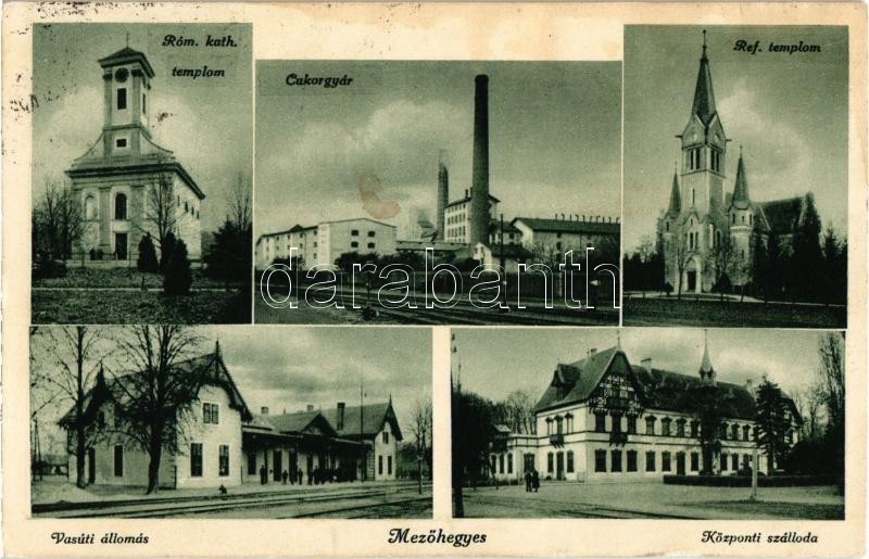 Leírás: Mezőhegyes, Római katolikus és református templom, cukorgyár, vasútállomás, központi szálloda