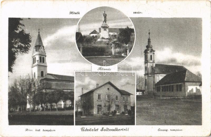 Leírás: Soltvadkert, Hősök szobra, vasútállomás, Evangélikus és római katolikus templom (EB)