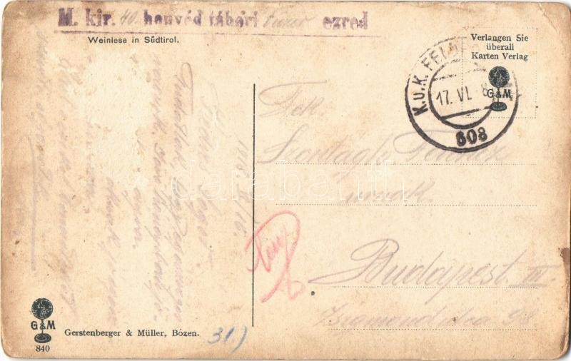 Leírás: 1918 Bolzano, Bozen (Südtirol); Weinlese in Südtirol / grape harvest in South Tyrol, folklore. Gerstenberger & Müller + "M. kir. 40. honvéd tábori tüzér ezred" "K.u.K. Feldpostamt 608" (worn corners)