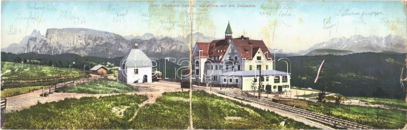 Renon, Ritten (Südtirol); Hotel Oberbozen am Ritten mit den Dolomiten / hotel, rack railway, tramcar. folding panoramacard (hajtásnál szakadt / torn at fold)