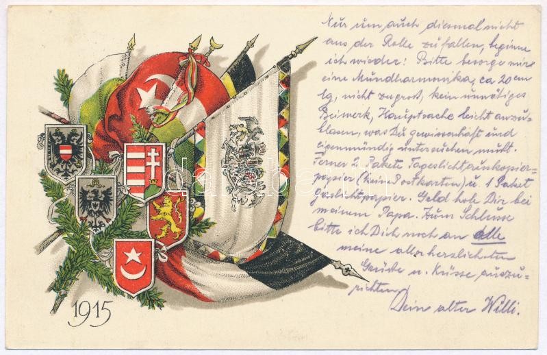 1915 Karácsony a harctéren. A Hadsegélyező Hivatal és a Vöröskereszt Együttes akciója. Központi hatalmak zászlói és címerei / WWI flags and coat of arms of the Central Powers. litho