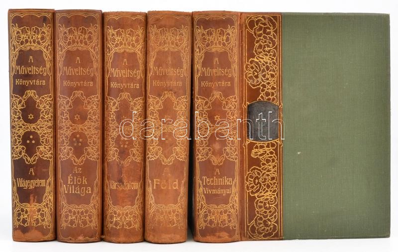 A Műveltség Könyvtára 5 kötete (A föld, Az élők világa, A technika vívmányai, A világegyetem, A társadalom.) Bp.,1906-1908,Athenaeum. Kiadói aranyozott, félbőr-kötésben, három köteten bronz plakettekkel, 2 köteten hiányzó plaketekkel (A föld, A társadalom), változó állapotban, kissé kopott borítókkal, két kötetben egy-két kijáró lappal