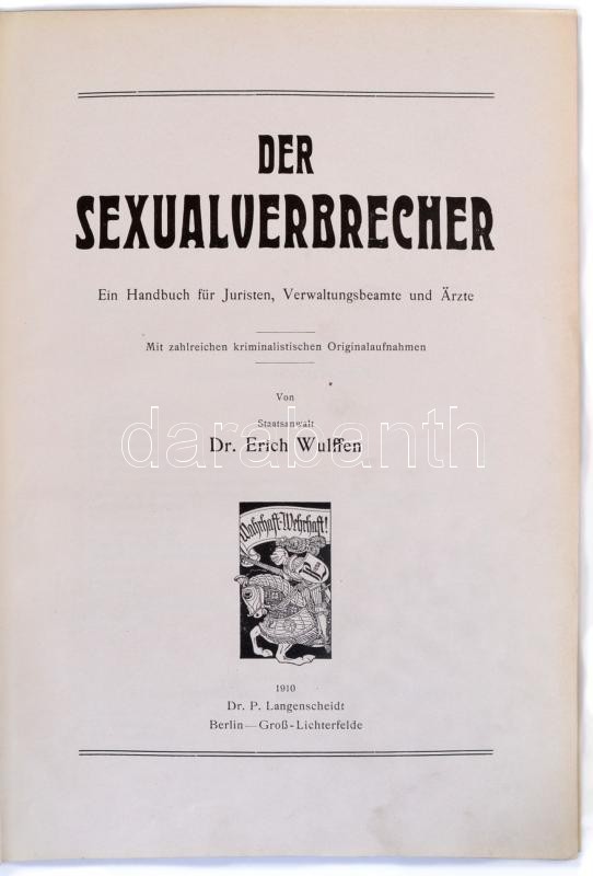 Dr. Erich Wulffen: Der Sexualverbrecher. Ein Handbuch für Juristen, Verwaltungsbeamte und Ärzte. Berlin-Groß-Lichterfelde, 1910., Dr. P. Langenscheidt. Német nyelven. Fekete-fehér fotókkal. Kiadói egészvászon-kötés, kissé kopott borítóval.
