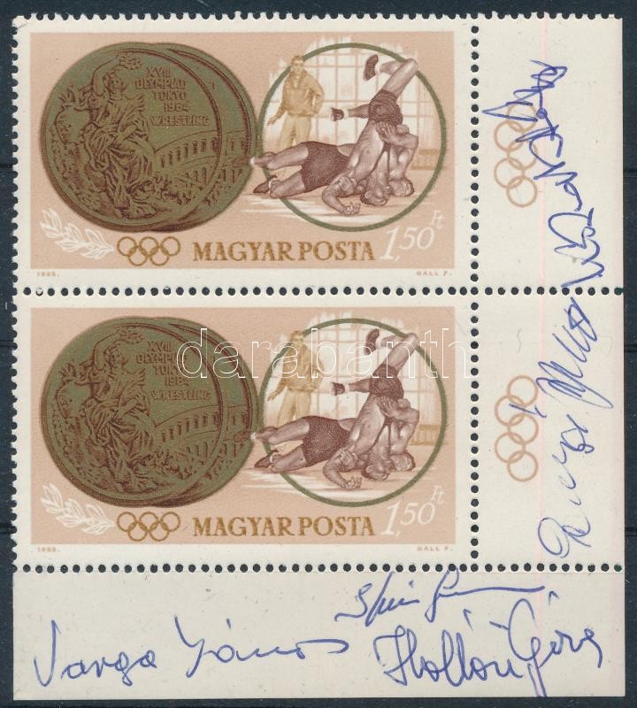 Leírás: Birkózó csapat tagjainak aláírása tokiói érmesek bélyegen (pl. Varga János, stb.)