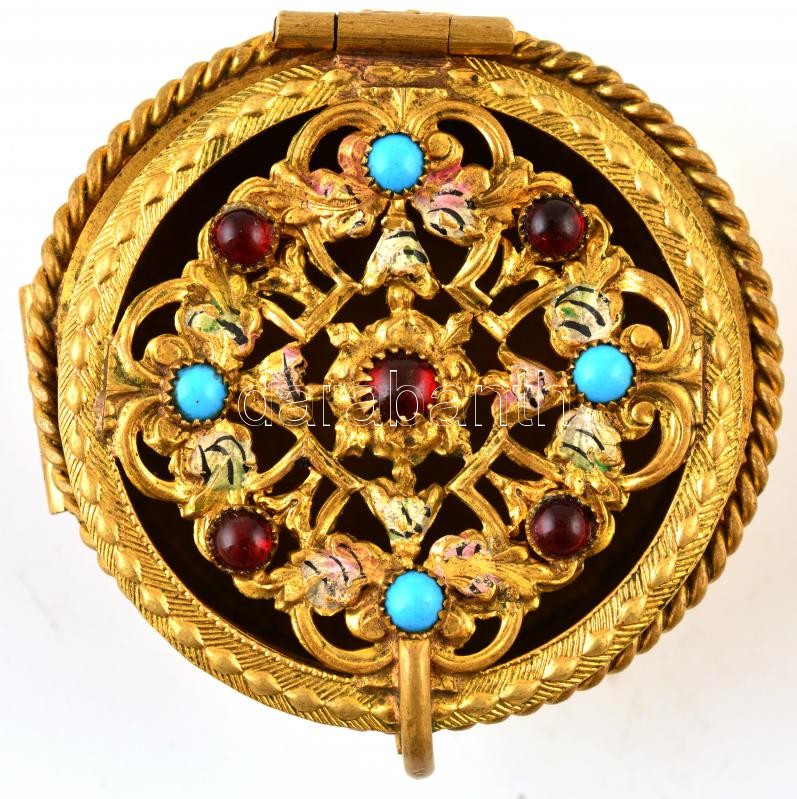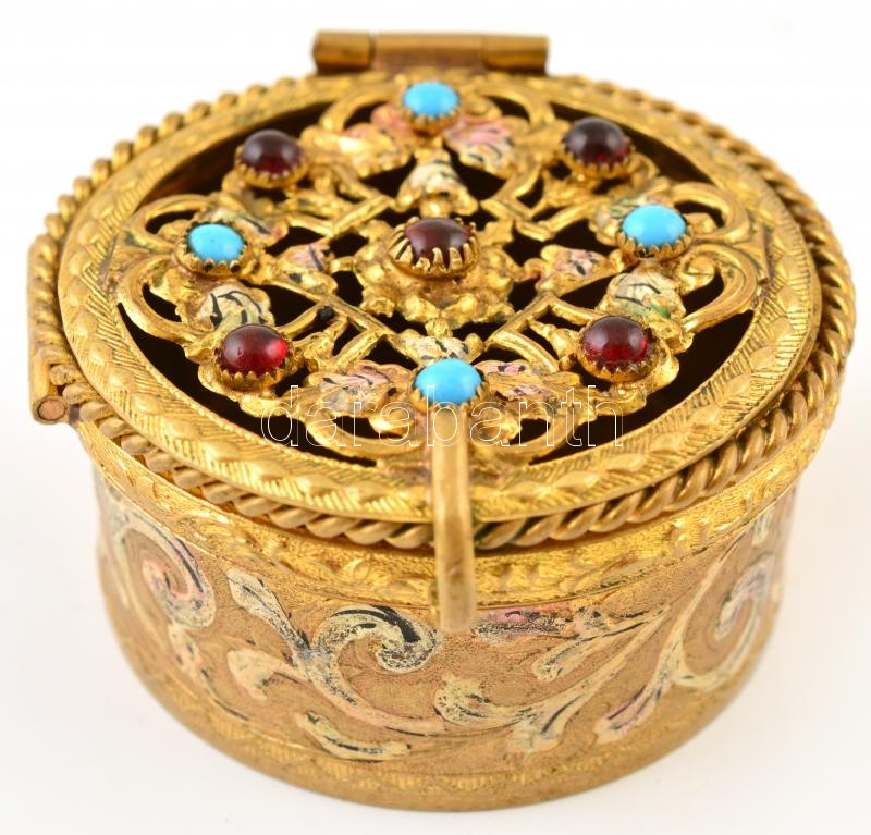 Leírás: Áttört mintás fém ékszertartó, kövekkel díszítve, m: 3 cm