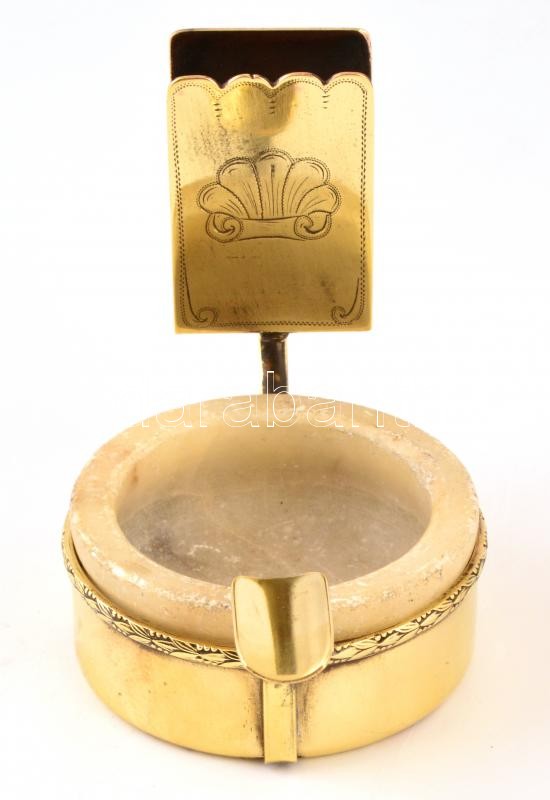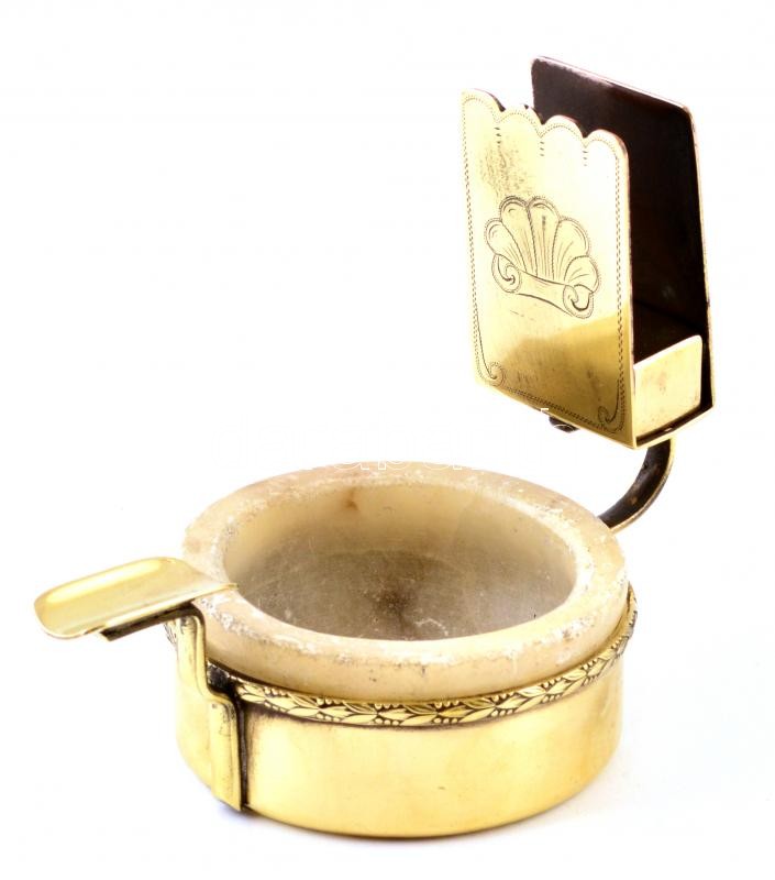 Leírás: Réz hamuzó gyufatartóval, alabástrommal, m: 11 cm, 14,5×7,5 cm