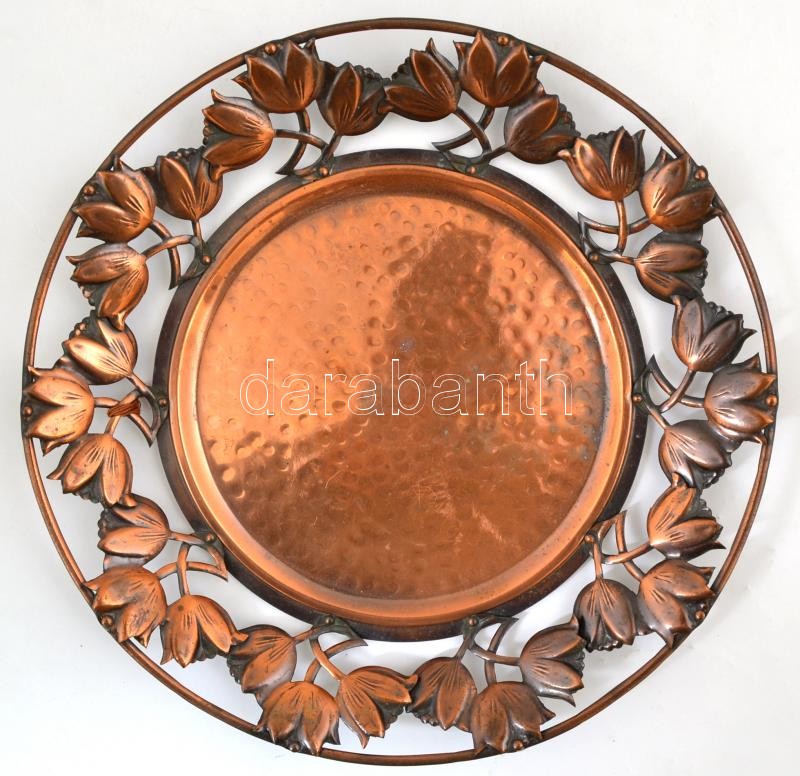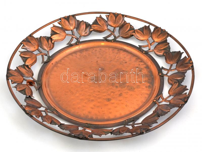Leírás: Vörösréz virágmintás dísztál, kis kopásnyomokkal, d: 24 cm