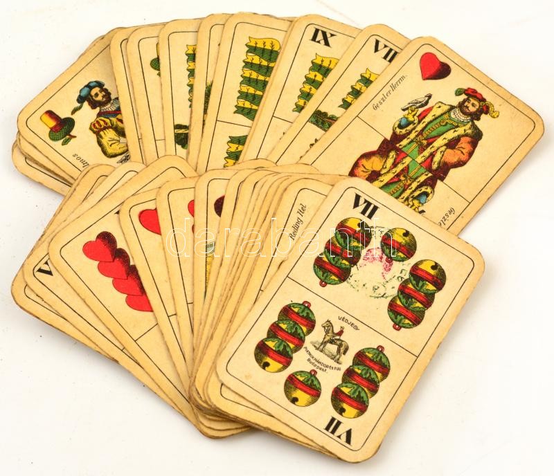 Piatnik mini magyar kártya, 32 lapos, kopott adóbélyeggel, 6x4 cm https://www.darabanth.com/hu/364-Gyorsarveres/364.0/Mutargy-papirregiseg-egyeb/Jatekok~500012/Piatnik-mini-magyar-kartya-32-lapos-kopott-adobelyeggel-6x4-cm~II2103093