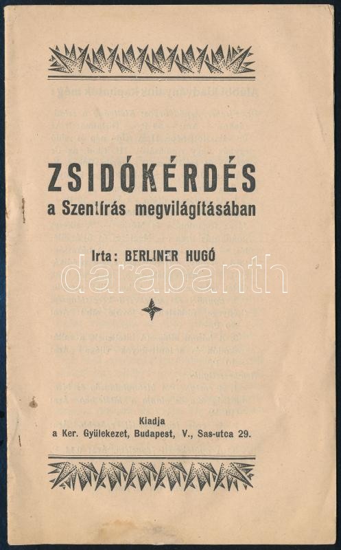 cca 1930 Berliner Hugó: Zsidókérdés a Szentírás megvilágításában, 24p https://www.darabanth.com/hu/364-Gyorsarveres/364.0/Mutargy-papirregiseg-egyeb/Judaika~500024/cca-1930-Berliner-Hugo-Zsidokerdes-a-Szentiras-megvilagitasaban-24p~II2106409