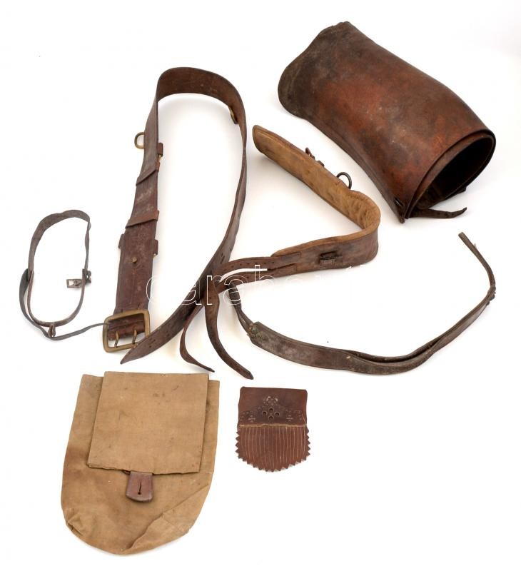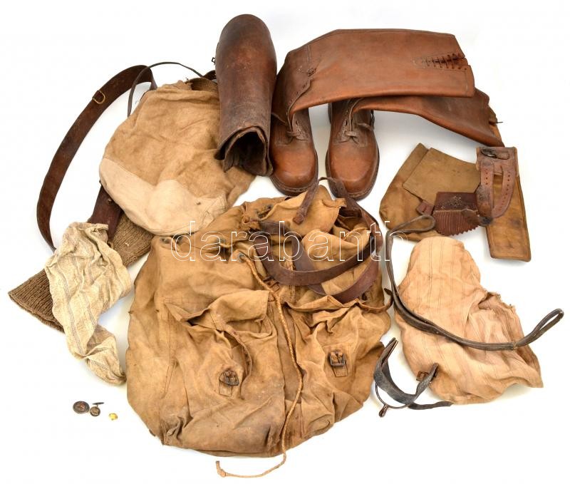 cca 1910-1920 Katonai ruházat részei, 1 csizmapár, 1 lábszárvédőpár, 1 pár csizmába való ruhaféle, 1 db harisnyaféle,1 db sarkantyú, hátizsák, tarisznya, szütyő, 2 szíj, 3 db gomb (mandzsettagomb: Nibelungentreue 1914). Összesen 15 db. Változó, többnyire viseltes/kissé viseltes, használt állapotban. A soproni Éder-család, feltehetőleg Éder Győző/Viktor (1890-1980) m. kir. ny. huszáralezredes, a brassói cs. és kir. 2. huszárezred egykori tagja hagyatékából.