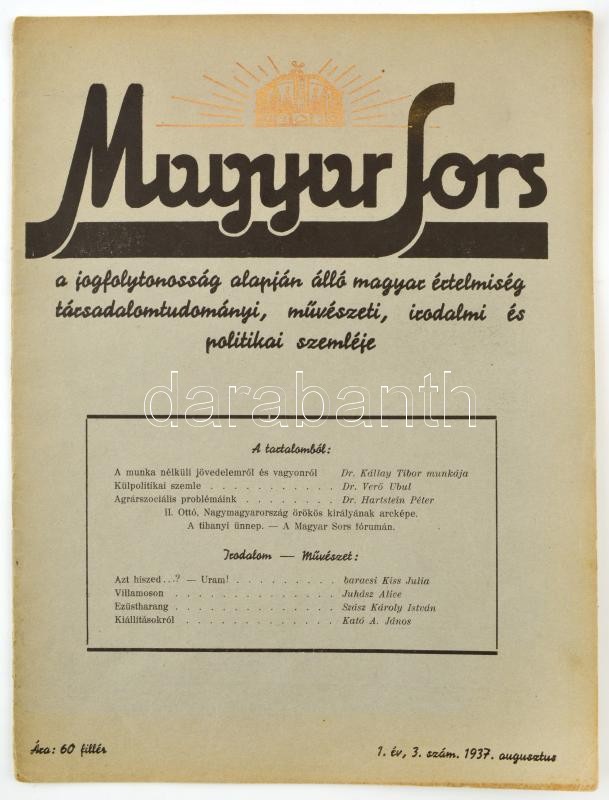 1937 Magyar Sors. I. évf 3. szám. https://www.darabanth.com/hu/364-Gyorsarveres/364.0/Mutargy-papirregiseg-egyeb/Nyomtatvanyok~500029/1937-Magyar-Sors-I-evf-3-szam~II2108528